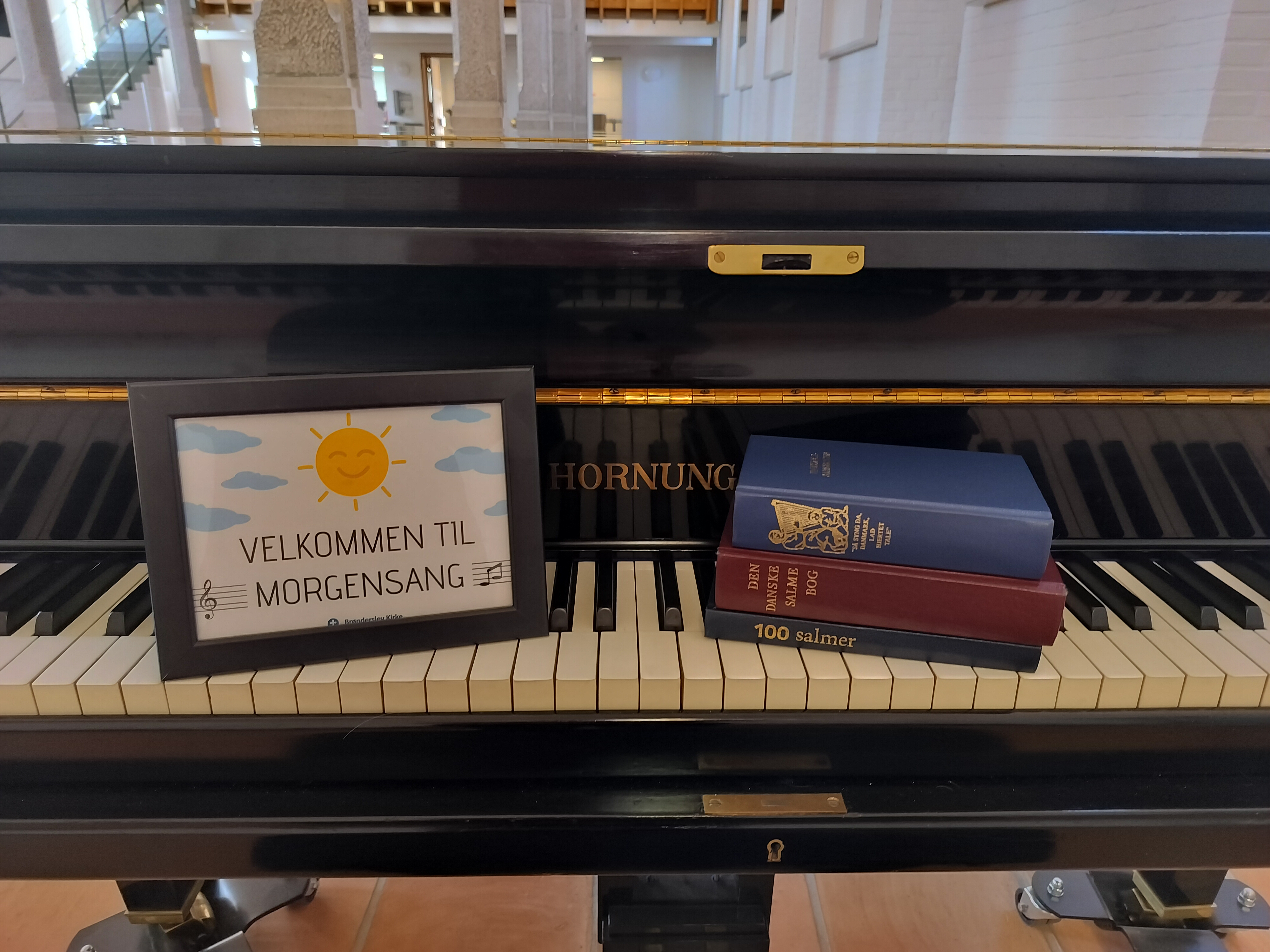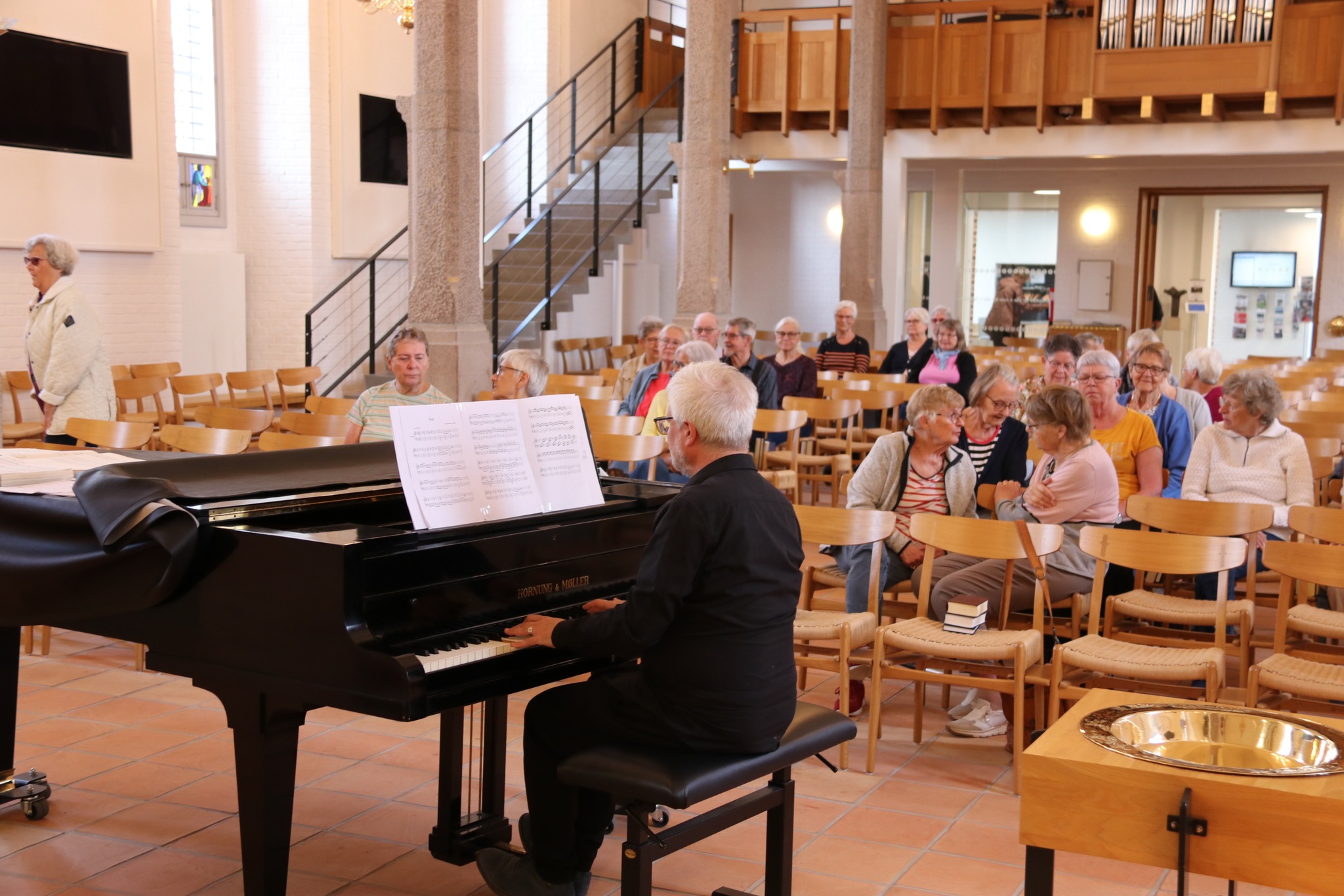 I dag er det organist Tobias Naumann, der står for morgensangen. Han spiller som regel nogle lette musikstykker på flyglet, inden han kl. 8.30 byder velkommen - og herefter leder den halve times fællessang. På forhånd er udvalgt nogle sange og salmer, som passer til årstiden og kirkens højtider. Som oftest er der også plads til ønsker fra deltagerne, inden morgensangen slutter med et fælles Fadervor.